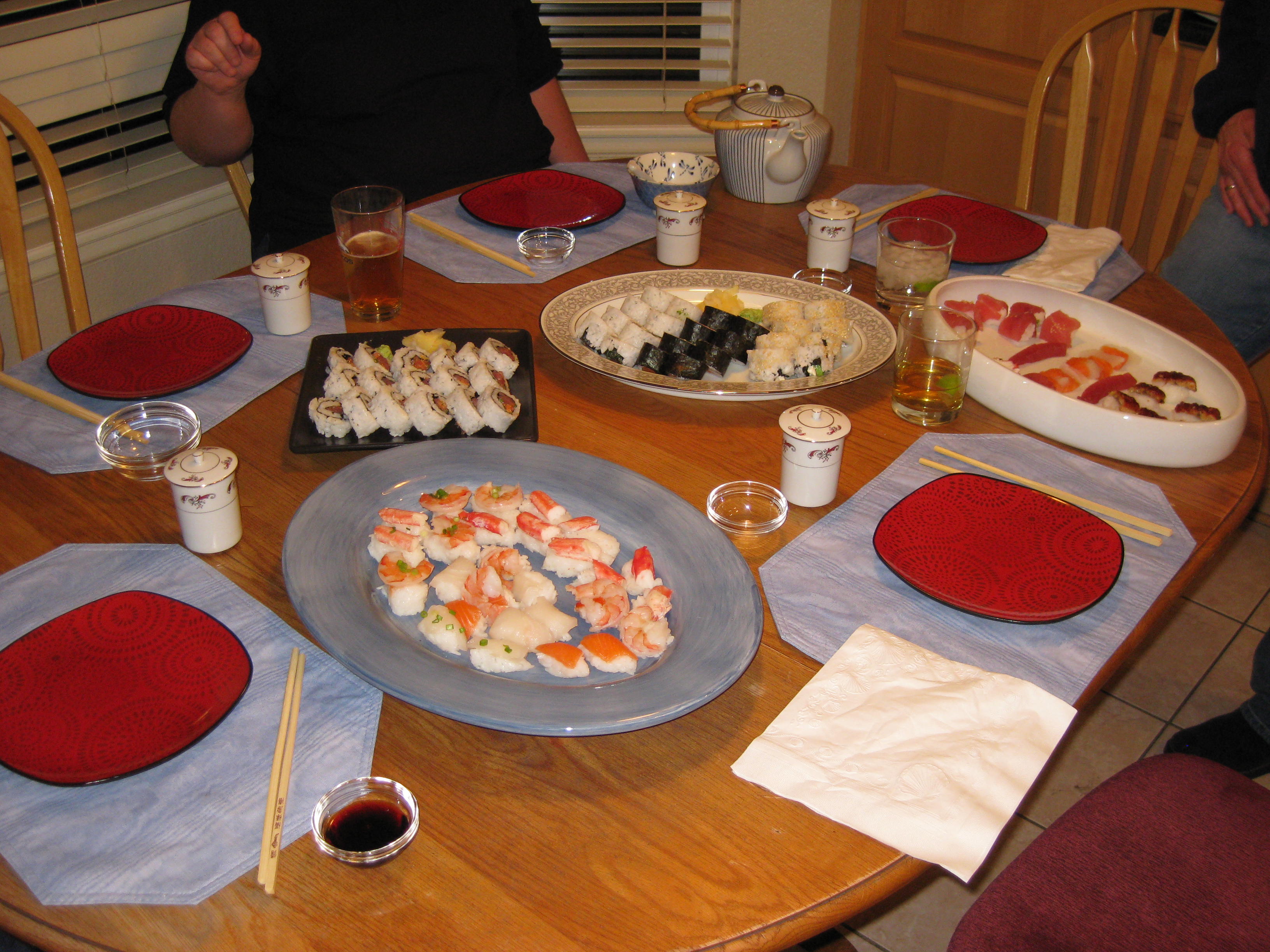 My sister, father and I went shopping, first to Costco, then we got some tasty Pho for lunch, and then we went to the Asian market. Let me just say, that we over bought. By the end of the process we had enough food for 10 people, and there were five of us eating. All told, there was delicious made from scratch Miso soup (is was really tasty, if I say so myself), 8 rolls (8-10 pcs per roll), and 34+ pieces of Nigiri and Sashimi. Aside from the fact that I couldn’t find the rice cooker instructions and over cooked the rice it went off without a hitch. I even got my brother in on making stuff. ” Logan, find a recipe for the spicy sauce in a spicy tuna roll. Hey, why don’t you make the sauce too? Hey, help me roll some of these.” If you’ve ever met my brother all 3 of those things being done without major begging is a serious feat.