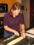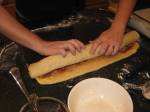 Roll dough from the long side, starting in the middle and working your way to the ends as you go. You might have to tug at the ends to make them fit. Try not to squeeze or press down too hard, all the filling will come out.